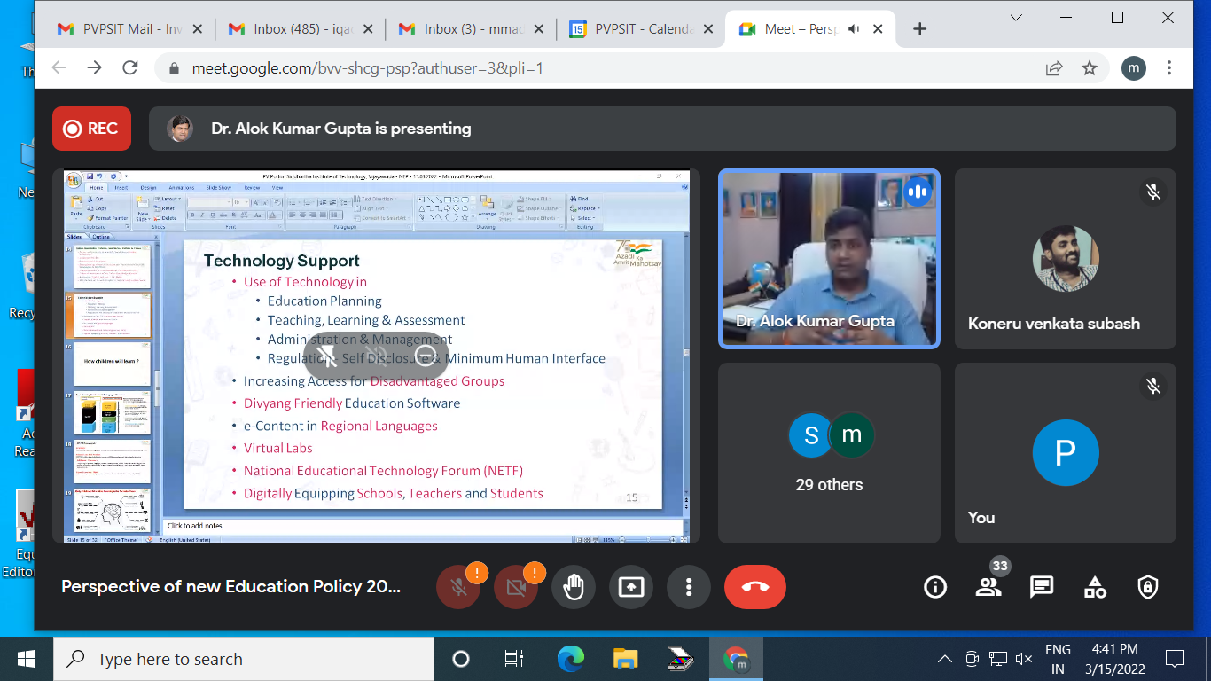 15-03-2022 A one day online webinar on “National Education Policy” on 15/03/2022. Dr. Alok Kumar Gupta , Regional Director, National Institute of Open Schooling , an Autonomous Institution under Ministry of Education , Govt. of India